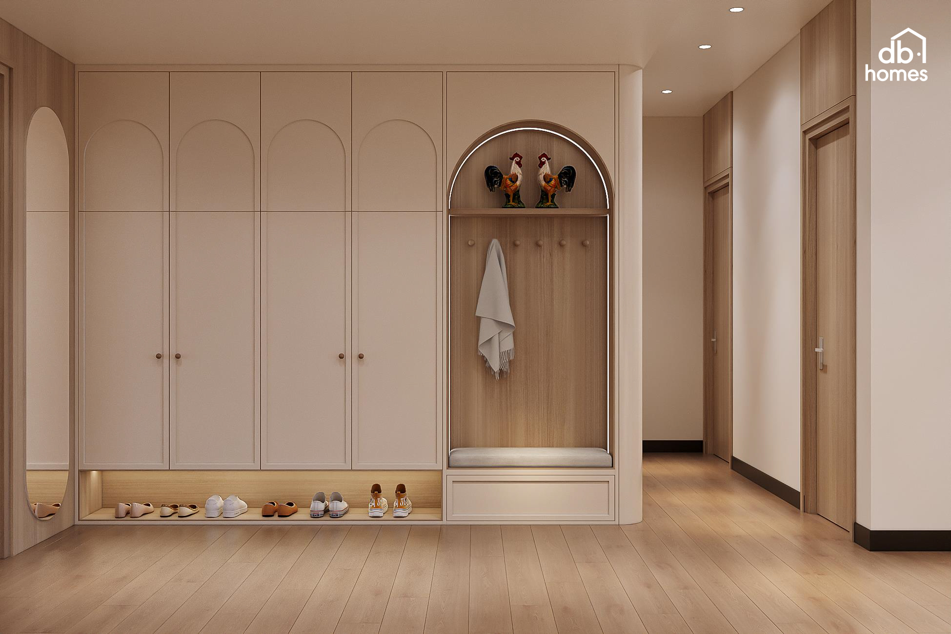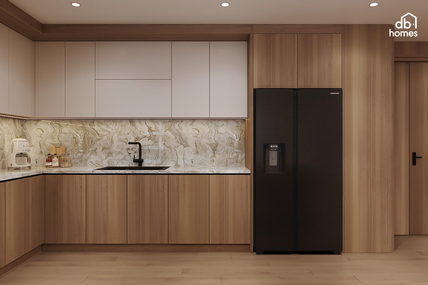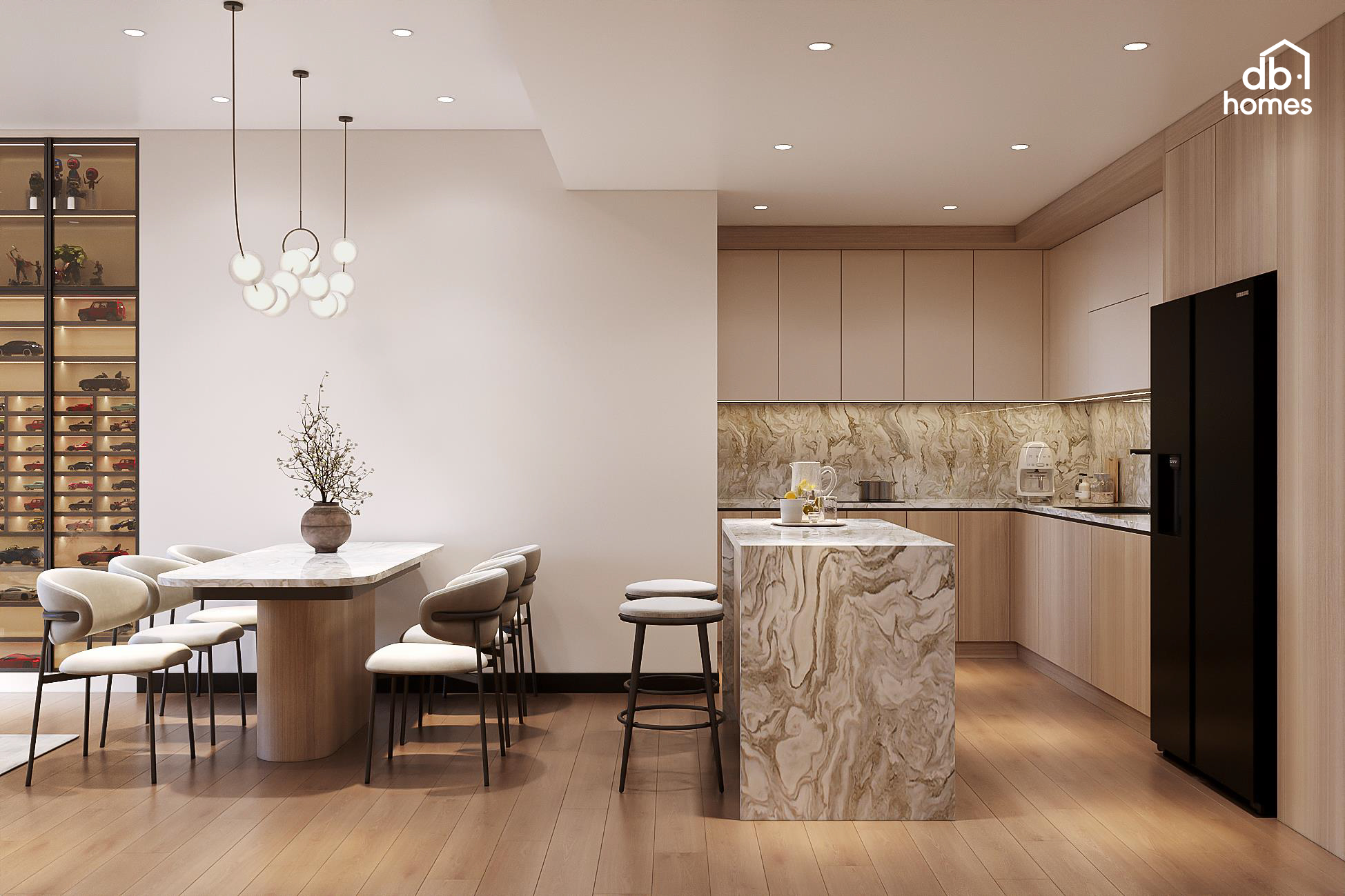 Điểm chạm đặc biệt của dự án nằm ở sự tinh tế trong việc lựa chọn chất liệu. Thấu hiểu khí hậu miền Bắc với những mùa nồm ẩm đặc trưng, đội ngũ DBHomes ưu tiên sử dụng hệ vật liệu chống ẩm mốc cao cấp cho toàn bộ nội thất. Giải pháp này không chỉ đảm bảo độ bền vững vượt trội mà còn giữ trọn vẻ đẹp nguyên bản và đẳng cấp của căn hộ theo thời gian.