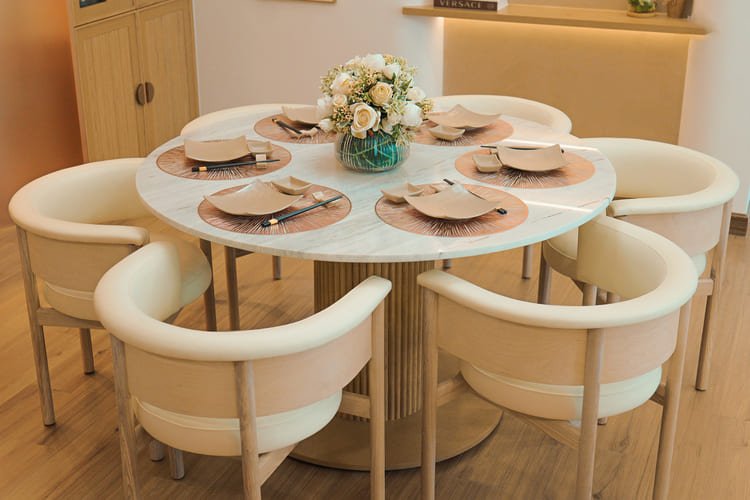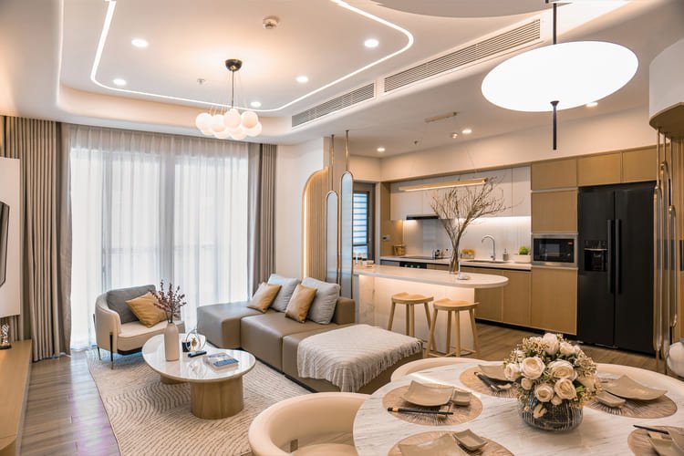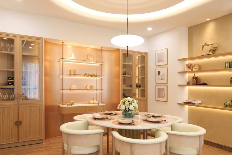 Căn hộ THE GOLDEN WHISPER tại THE HORIZON PHÚ MỸ HƯNG là một tác phẩm nghệ thuật được DBHomes thiết kế tinh tế, kết hợp giữa các đường nét vuông vức và tròn trịa. Sự mềm mại của những đường cong, bo tròn tượng trưng cho Trời, trong khi các chi tiết vuông vức, góc cạnh tượng trưng cho Đất. Các đường cong tinh tế xuất hiện trên bàn ghế, sofa, đèn trần và vách ngăn, tạo sự cân bằng với nội thất đường thẳng. Với sự tỉ mỉ và tâm huyết, DBHomes đã sử dụng nhiều đường cong để mang lại cảm giác dễ chịu và giúp giảm căng thẳng cho gia chủ, tạo nên một không gian sống hoàn hảo.