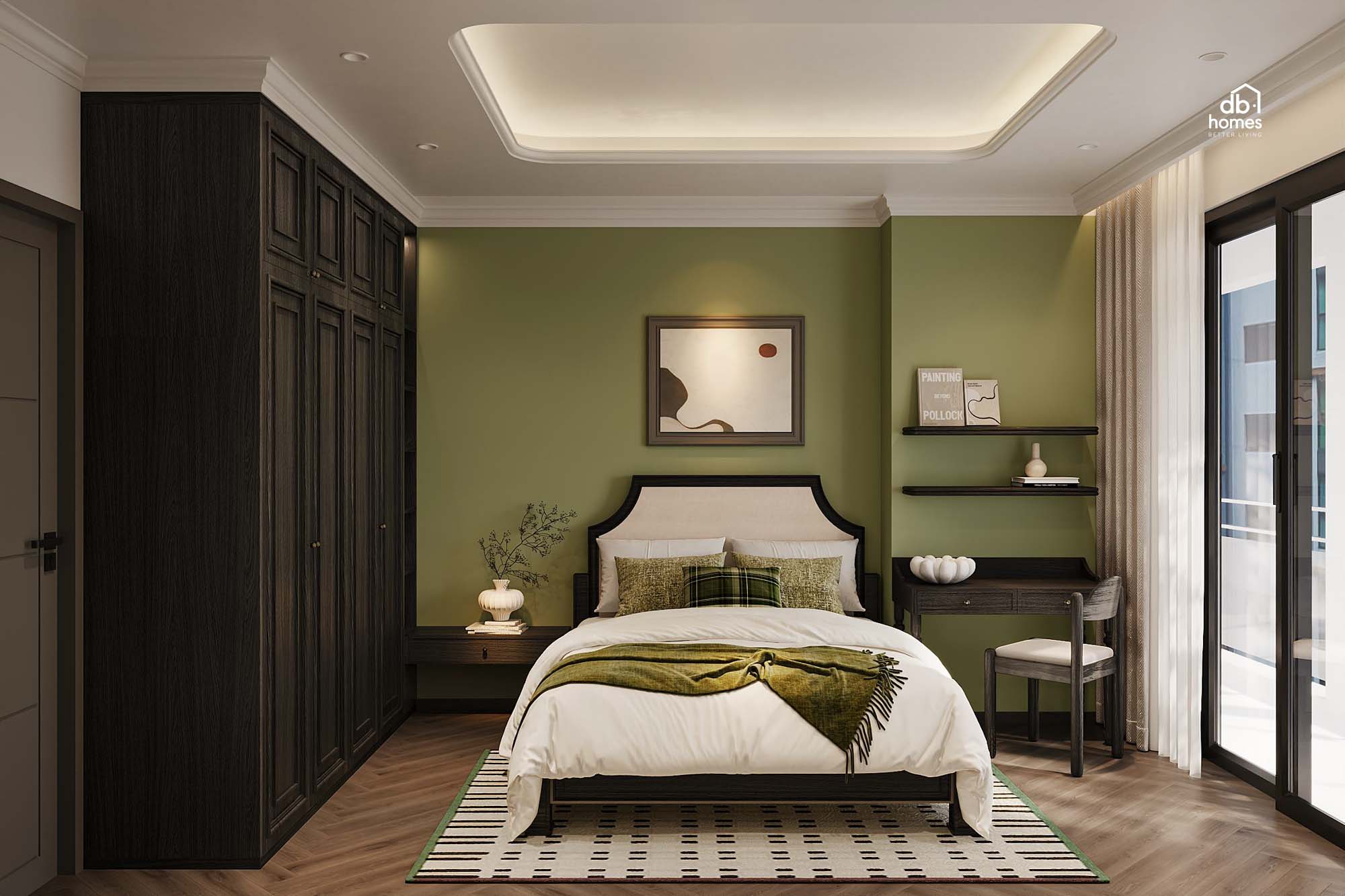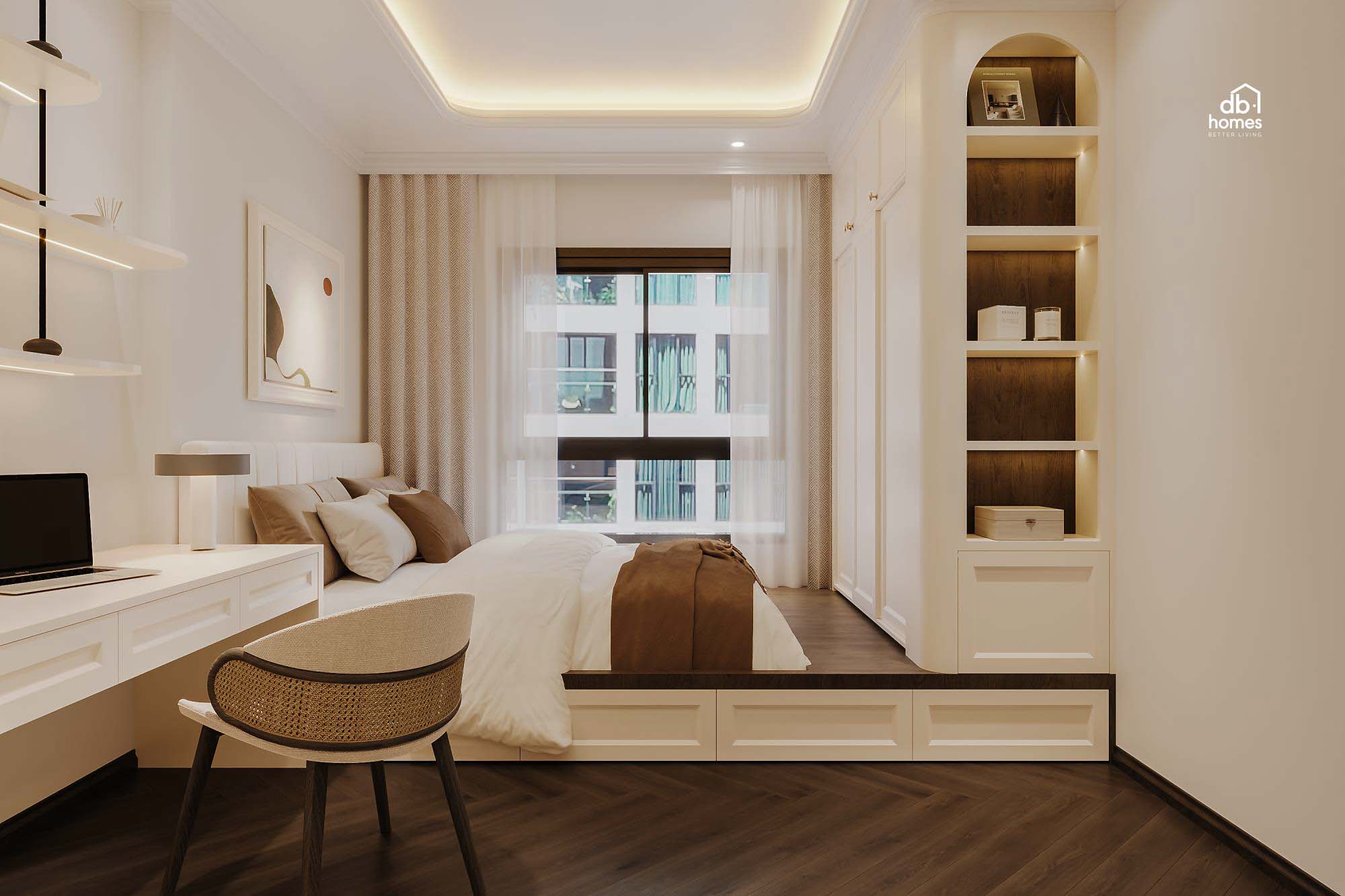 Phòng ngủ trong dự án được thiết kế đa dạng nhằm đáp ứng nhu cầu và cá tính riêng của từng thành viên trong gia đình. Phòng ngủ master mang tinh thần cổ điển thanh lịch, với bảng màu ấm cùng các chi tiết phào và vật liệu gỗ tạo nên cảm giác sang trọng nhưng vẫn nhẹ nhàng, thư giãn.
