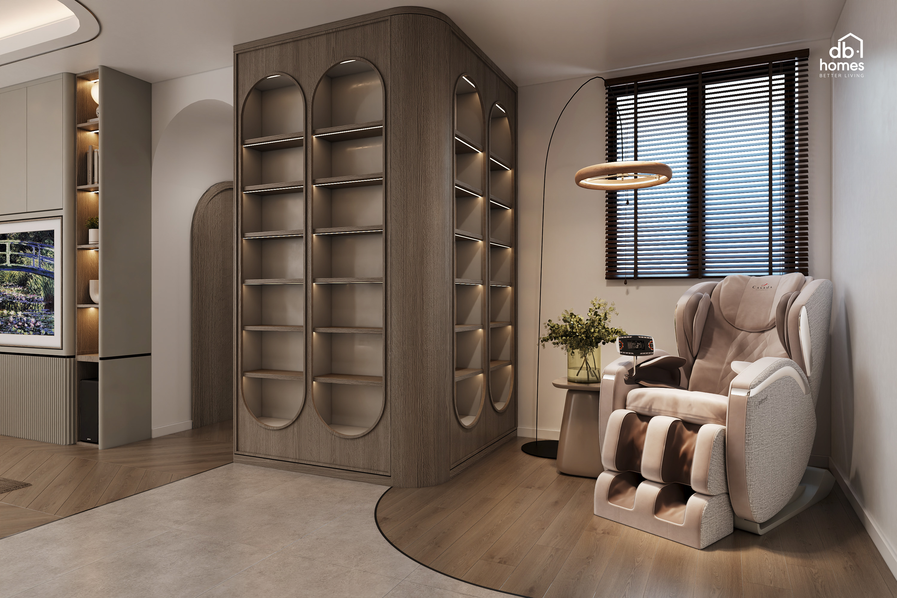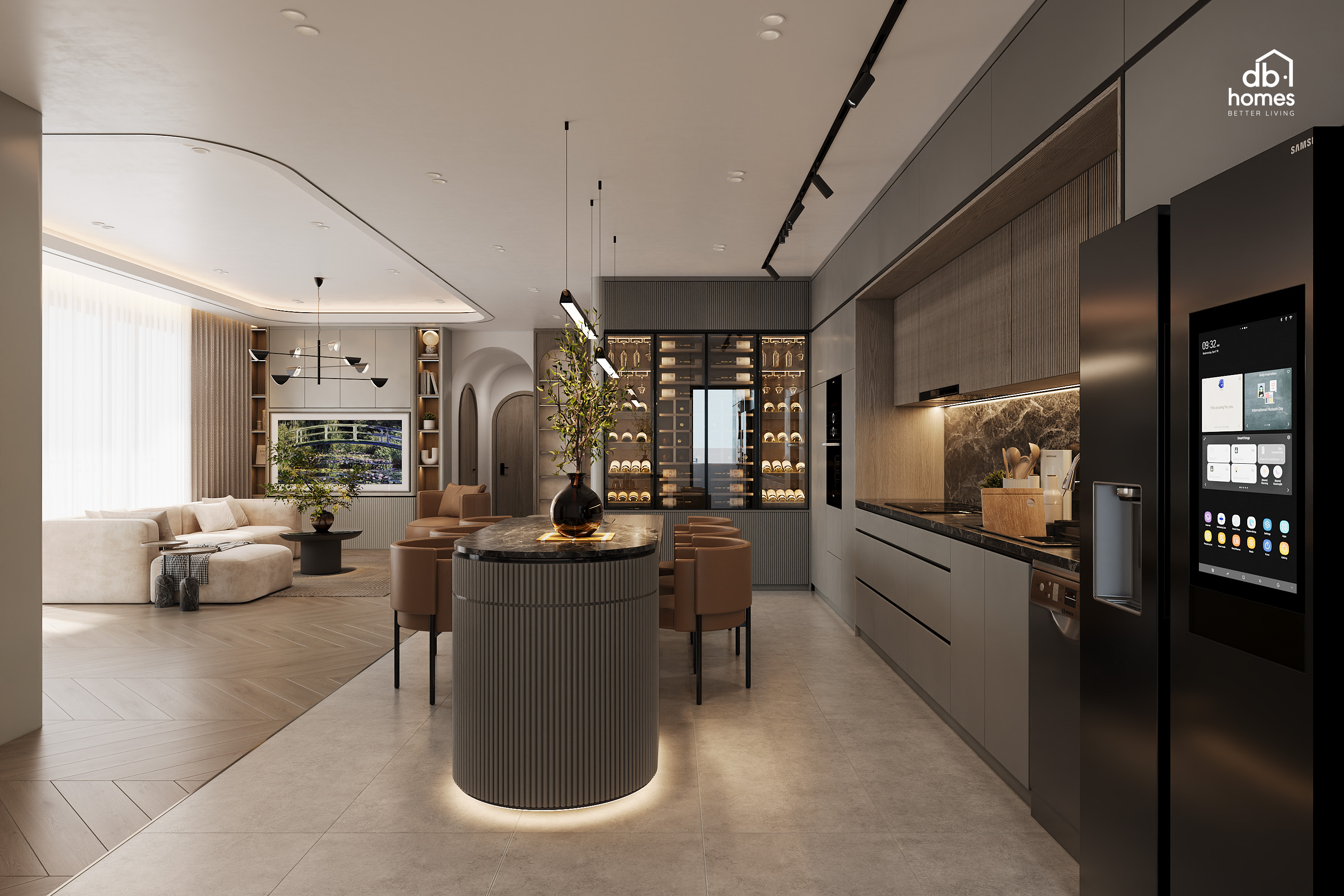 Không gian được hình thành như một dòng chảy liên tục, các đường cong mềm mại trên trần và vách phản chiếu tinh thần kiến trúc “layering” của Oasis Layered Home, nơi từng khu vực gắn kết tự nhiên theo tinh thần “Open Flow” mở rộng, thoáng đãng nhưng an toàn. Các chi tiết nội thất được bo mềm toàn bộ, đúng mong muốn “không kim loại - không kính - không góc nhọn” của gia chủ. Thiết kế tủ rượu theo đúng mẫu gia chủ yêu thích với kết cấu gỗ sồi nhạt và đường cong mềm. Ánh sáng hắt vàng nhẹ tạo nên một “wine corner” sang trọng như lounge khách sạn 5 sao.
