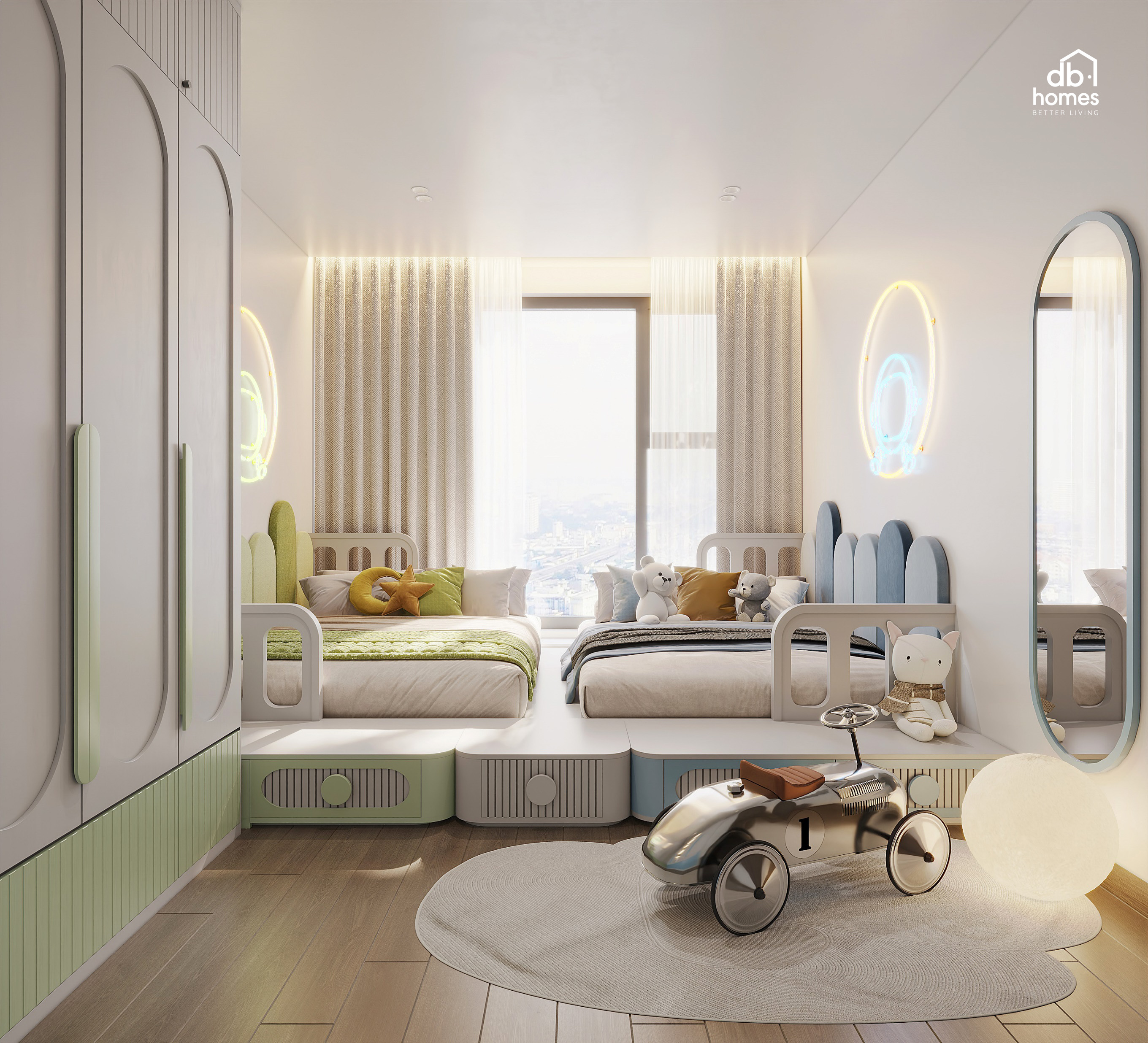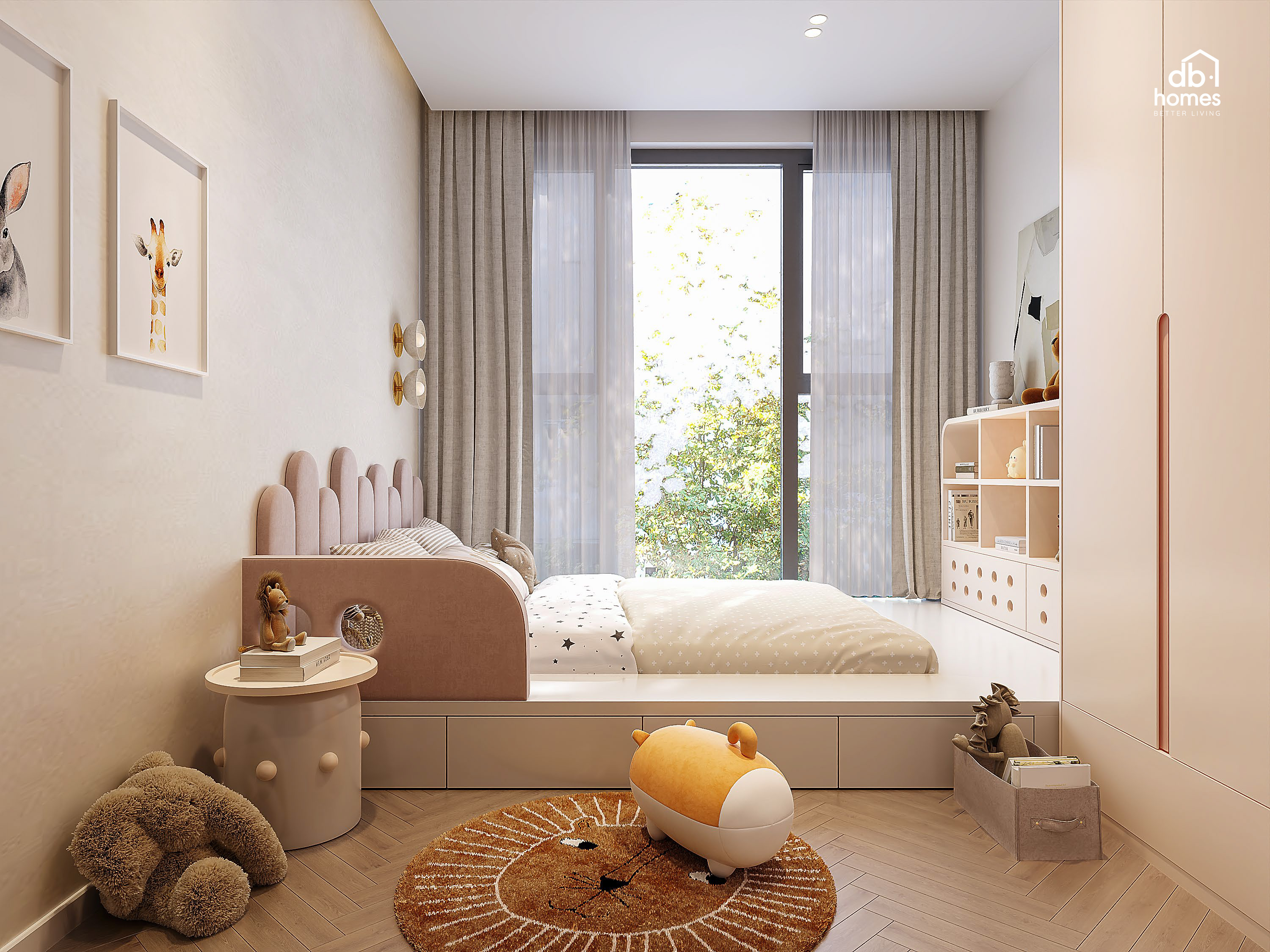 Tại Feliz En Vista - nơi được mệnh danh là “ốc đảo thẳng đứng” giữa lòng Thủ Thiêm, căn hộ 159m² này được DBHOMES thiết kế và thi công nội thất, nơi mọi đường cong, ánh sáng và vật liệu đều được xếp lớp tinh tế, phản chiếu đúng tinh thần kiến trúc phân tầng đặc trưng của dự án. Lấy tinh thần “Soft Modern – Safe Living” làm trọng tâm, toàn bộ thiết kế được phát triển xoay quanh ba yếu tố: bo cong - gỗ sồi nhạt - công năng tối ưu, mang đến một môi trường sống an toàn và lý tưởng cho ba bé nhỏ trong nhà.