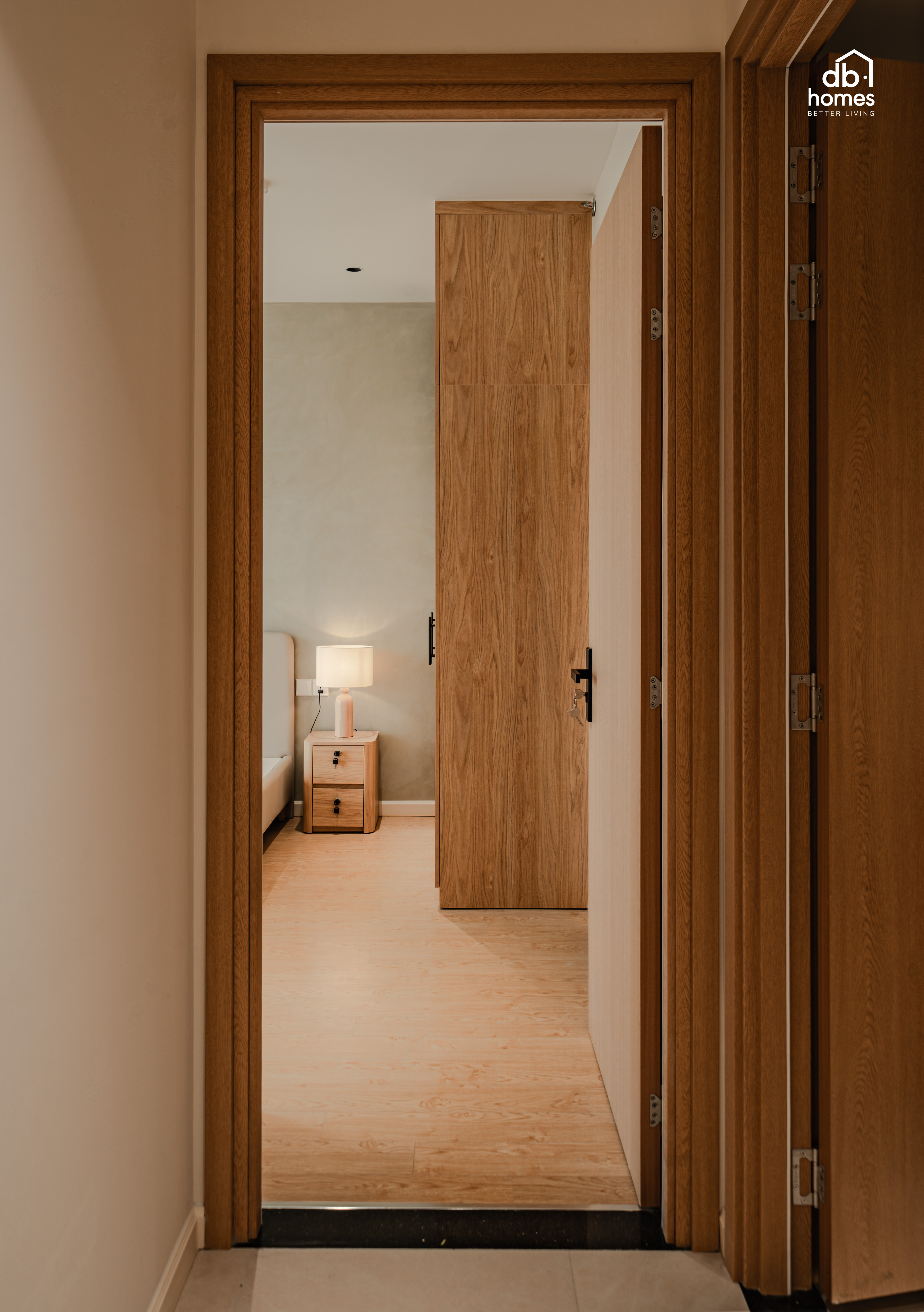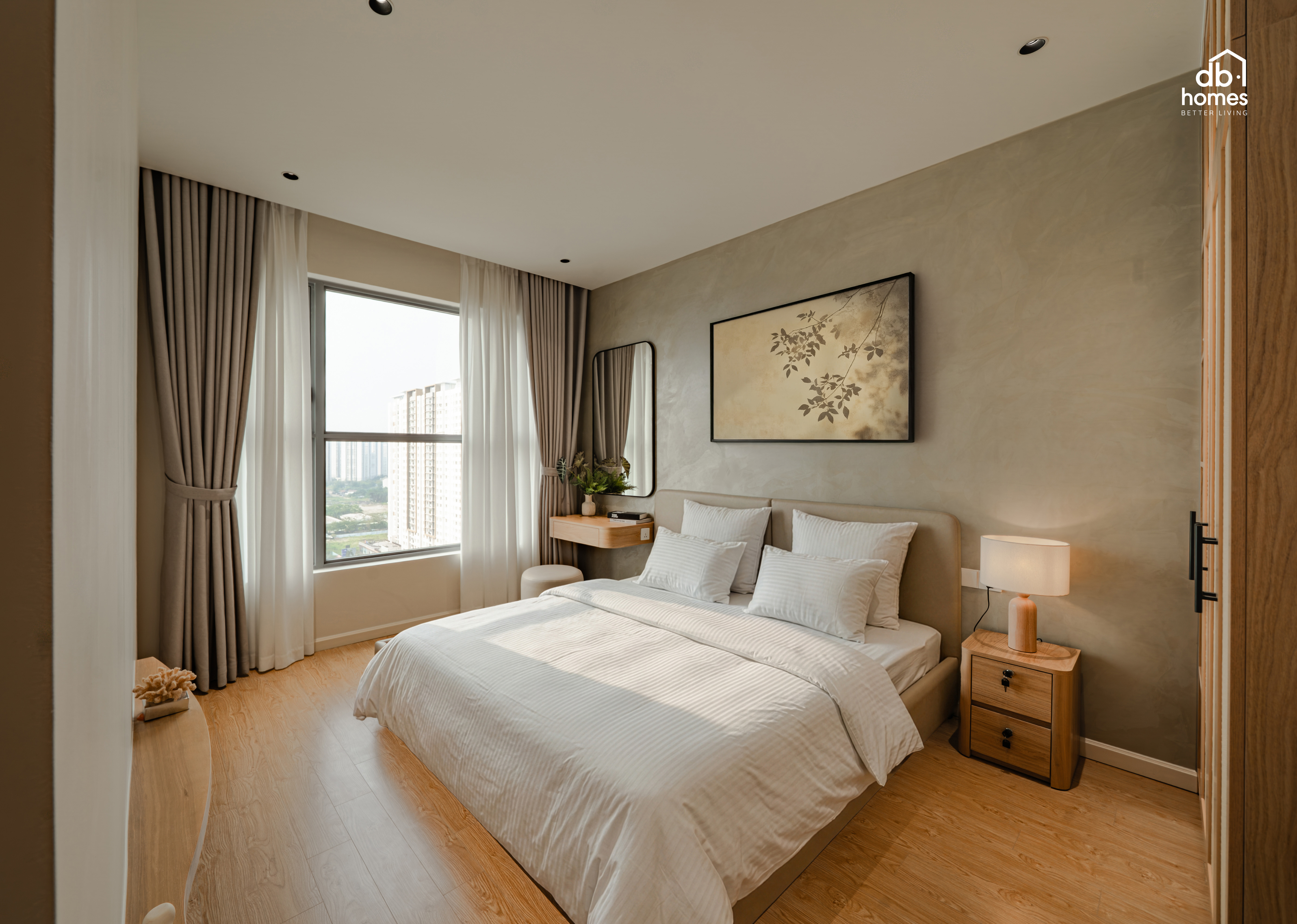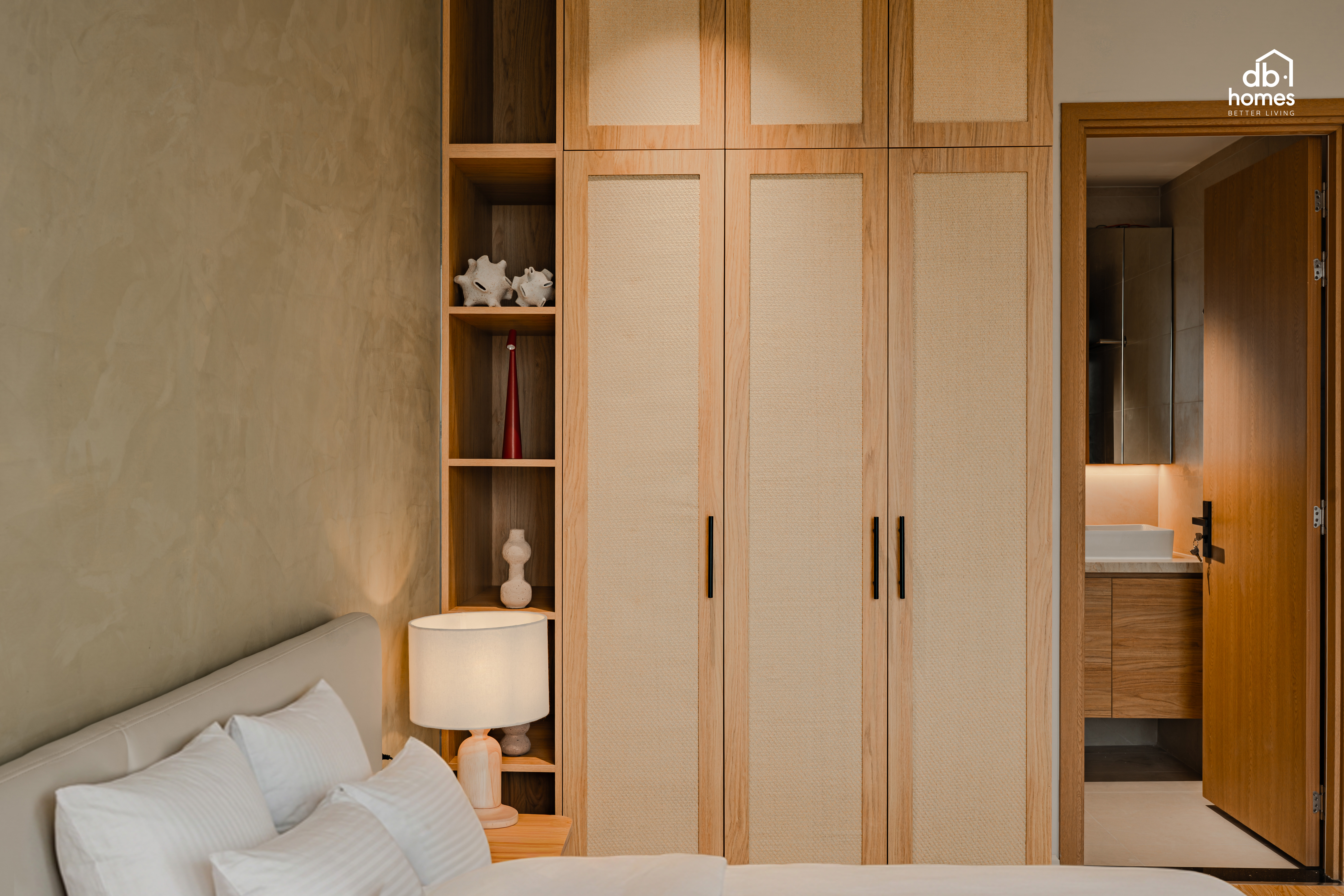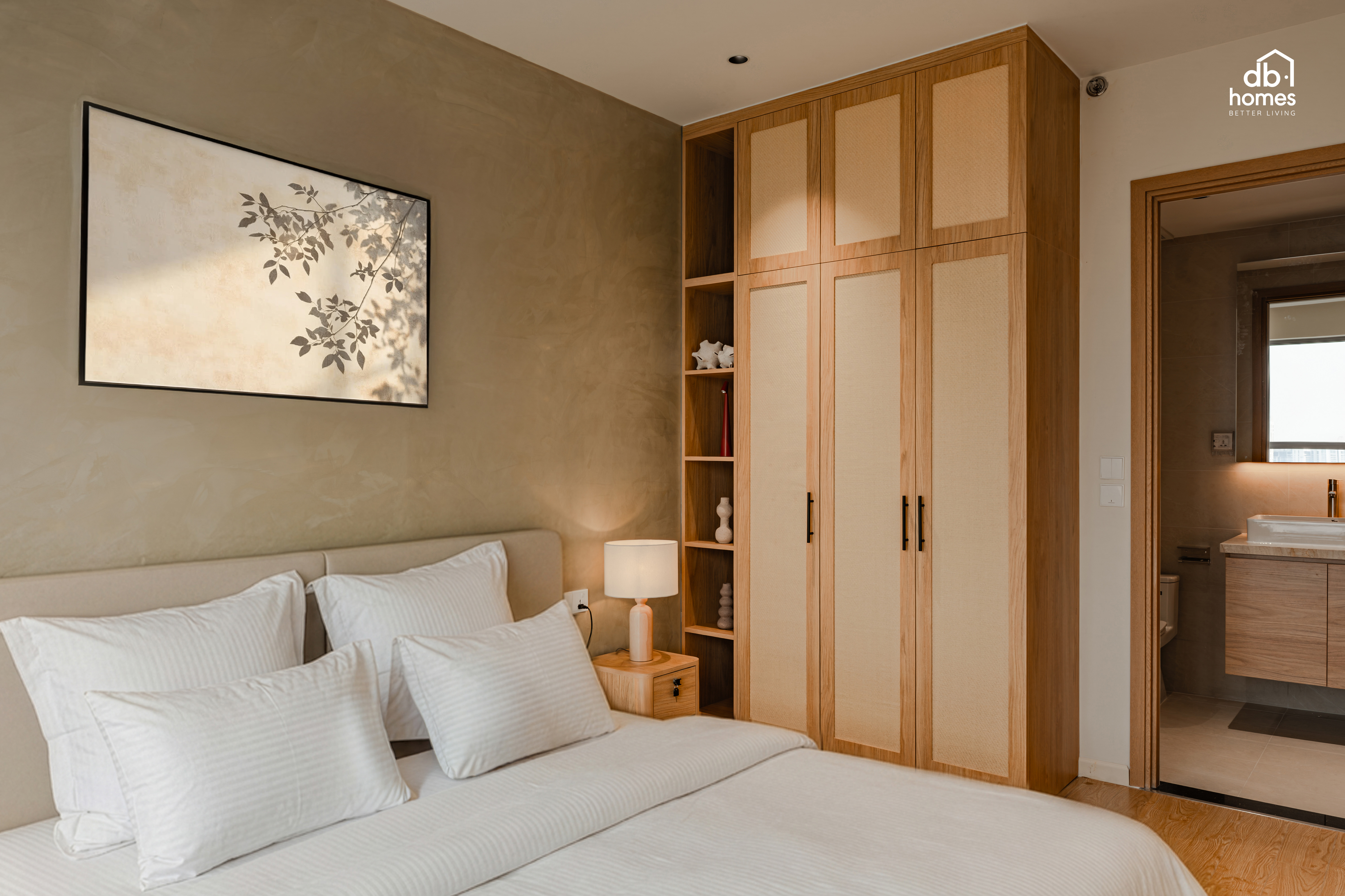 Tinh thần Wabi Sabi được thể hiện xuyên suốt thông qua bảng màu trung tính nhẹ nhàng cùng việc lựa chọn các vật liệu mang tính thủ công như tủ quần áo được ốp mây tre đan, kết hợp với các hạng mục nội thất gỗ do DBHomes trực tiếp sản xuất tại xưởng riêng Module, giúp không gian vừa giữ được sự mộc mạc mà vẫn đảm bảo độ bền.