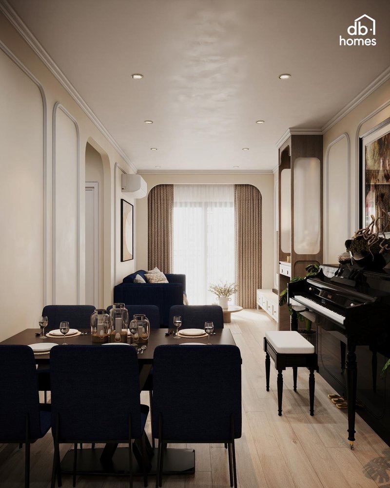 Khi đưa vào nội thất D-Homme, nhất là căn 3PN hoặc duplex, phong cách Neo Classic giúp tôn vinh chiều cao trần và hệ cửa sổ lớn bằng cách tạo điểm nhấn ở tường – trần – đèn. Không gian trở nên bề thế và sang trọng, thích hợp cho gia chủ yêu nghệ thuật và gu sống cổ điển hiện đại.