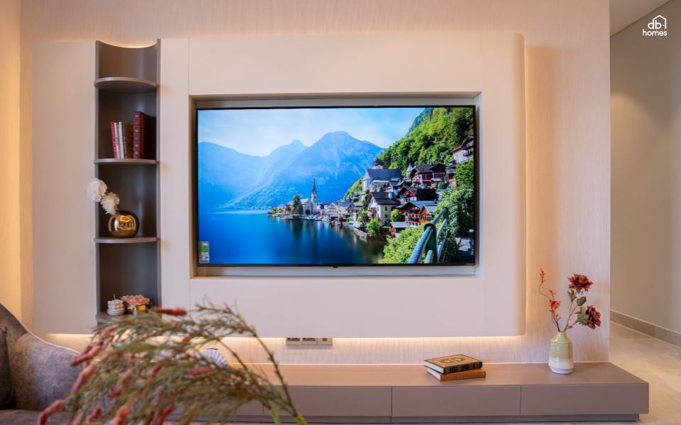 Không gian mở kết nối phòng khách và bếp mang đến sự liền mạch, chan hòa ánh sáng tự nhiên và gió trời một cách cân bằng hoàn hảo giữa tiện nghi và tự do. Mảng tường TV bo cong kết hợp với đèn hắt và kệ uốn lượn tạo điểm nhấn ấm áp, sang trọng. Gam trung tính, chất liệu gỗ và ánh sáng nhẹ mang lại vẻ tinh tế, an yên, qua đó hoàn thiện không gian sống hiện đại và thư thái.