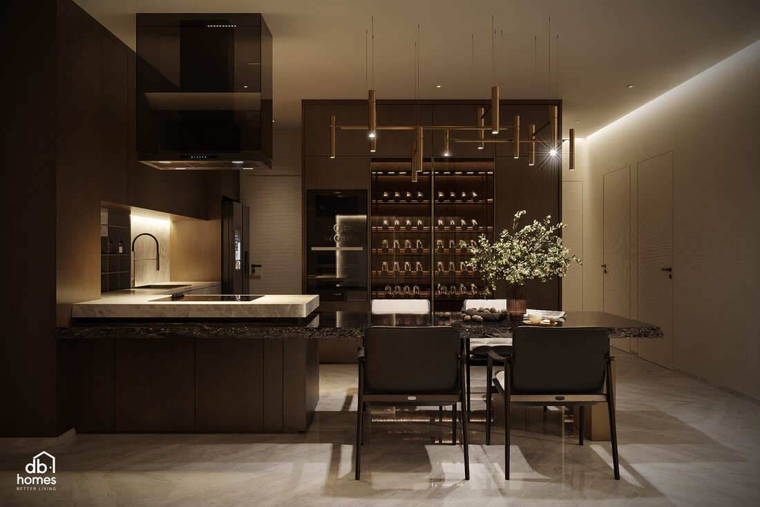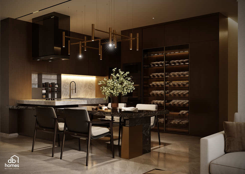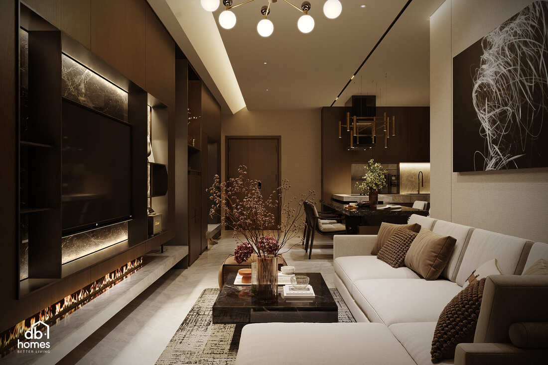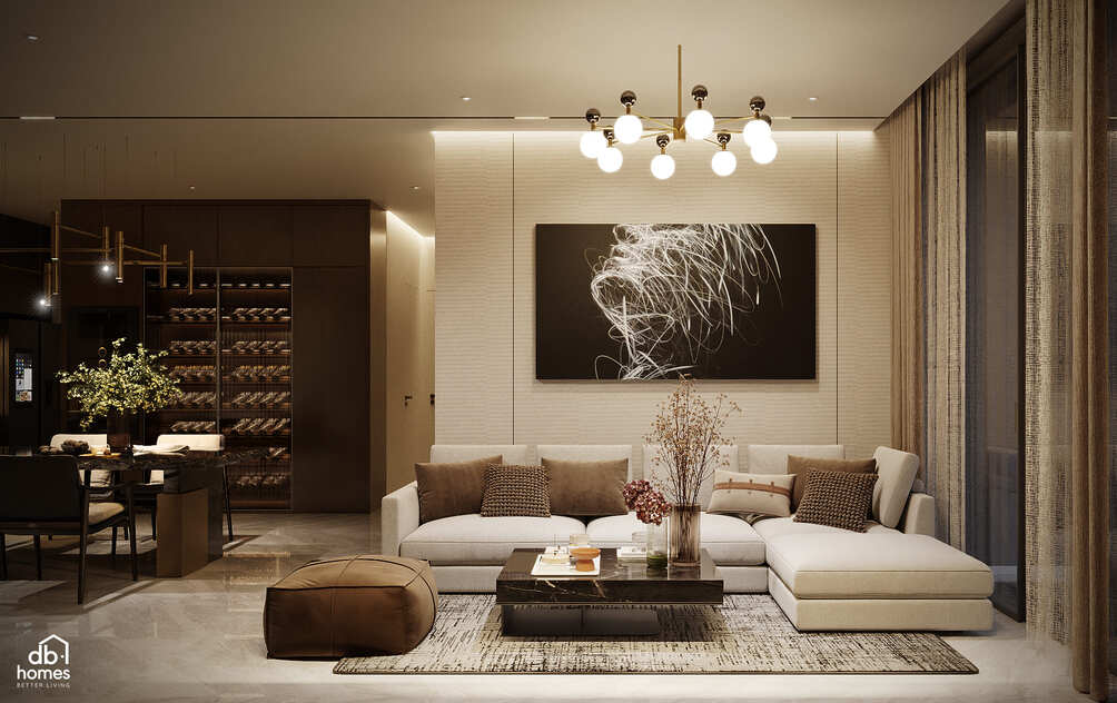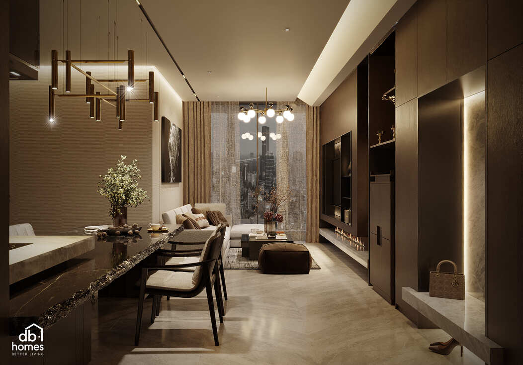 Là căn hộ thuộc khu chung cư cao cấp The Peak Midtown Phú Mỹ Hưng ở quận 7 với vị trí đắc địa ở phía nam thành phố và ngay cạnh sông Sài Gòn, DBHomes đã phác thảo và thi công ý tưởng dựa trên sự kết hợp hoàn hảo của hai trường phái Sang trọng và Hiện đại . Do vậy, những khối vuông, chữ nhật, kết hợp với đường cong tròn hay oval mềm mại, đi cùng chất liệu kim loại, gỗ và kính với bảng màu beige tone trầm ấm, góp phần mang tới dáng vẻ kiêu kỳ và thanh lịch cho căn hộ Refined Peak.